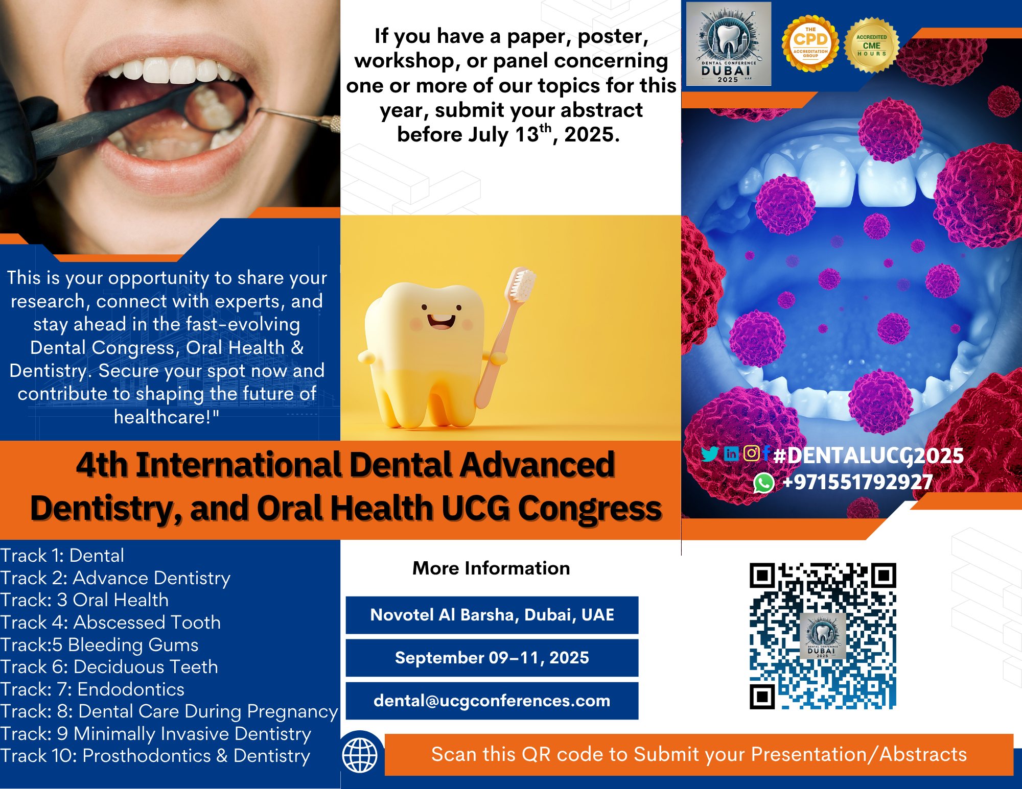 The 4th International UCG Congress on Dentistry, Advanced Dental Science & Oral Health brings together world-class researchers, clinicians, academics, and industry leaders through a well-structured lineup of 29 specialized scientific tracks. Each session is crafted to bridge evidence-based knowledge with practical application, creating a meaningful learning experience for every dental professional.