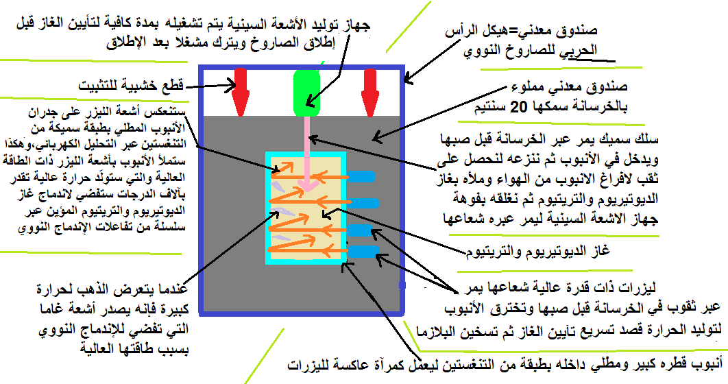 ولضمان اكتمال التفاعلات المتسلسلة لاندماج النووي سنقوم بوضع الانبوب وسط صندوق طول أضلاعه 20 سنتيم لنملأه بالخرسانة ونتركها حتى تيبس ثم نركب القنبلة في رأس الصاروخ ويشغل جهاز الأشعة السينية(يمكننا استخدام الماغنترون الخاص بأفران الميكروييف) قبل الإطلاق,والليزرات عند سقوط الصاروخ بفضل صاعق صدمي,مع العلم ان الاندماج النووي يحدث في اجزاء من الثانية عندما تسخن البلازما بالليزرات,واليكم صورة توضح تصميم لصناعة هذه القنبلة النووية