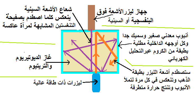 لقد وضعنا غاز الديوتيريوم و التريتيوم في أنبوب معدني صغير وسميك جدا وكل أوجهه الداخلية مطلية بطبقة من التنغستين عبرالتحليل الكهربائي وسنفرغه من الهواء ونغلقه باحكام وتكون فيه فتحات لنملأه بغاز الديوتيريوم والتريتريوم ولمرور شعاع الأشعة فوق البنفسجية أو السينية وكذلك أشعة الليزر