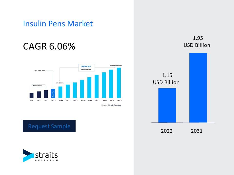 According to Straits Research, the global insulin pens market size was valued at USD 1159.09 million in 2022. It is projected to reach from USD XX Billion in 2023 to USD 1,954.86 million by 2031, growing at a CAGR of 6.06% during the forecast period (2023–2031).