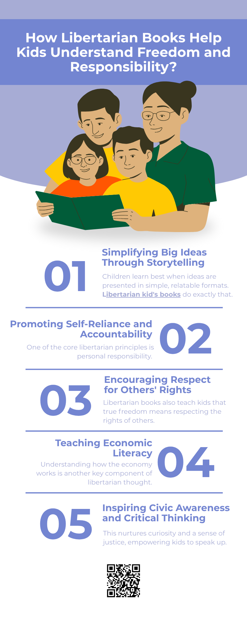Libertarian kid's books teach children about the importance of personal freedom and responsibility through engaging stories and relatable characters. These books highlight how choices have consequences and the value of respecting others' rights. By exploring concepts like voluntary cooperation and individual liberty, libertarian kids books help young readers develop critical thinking skills and a deeper understanding of how freedom works in everyday life, encouraging them to become thoughtful and responsible individuals.