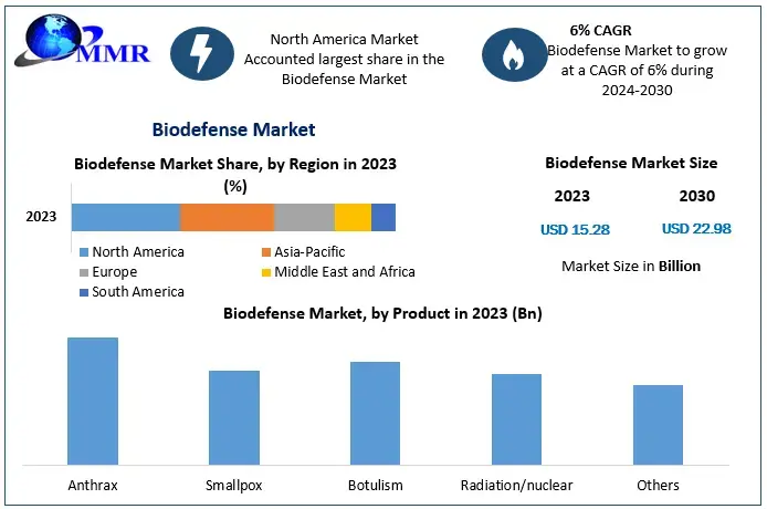 Biodefense Market size is expected to reach USD 22.98 Bn. by year 2030 at a CAGR of 6% during the forecast period.