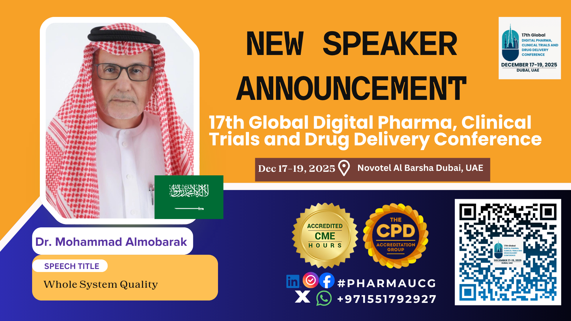 Dr. Almobarak will be speaking at the 17th Global Digital Pharma, Clinical Trials & Drug Delivery Conference on the topic “Whole System Quality.” Pharmacy Conference+1