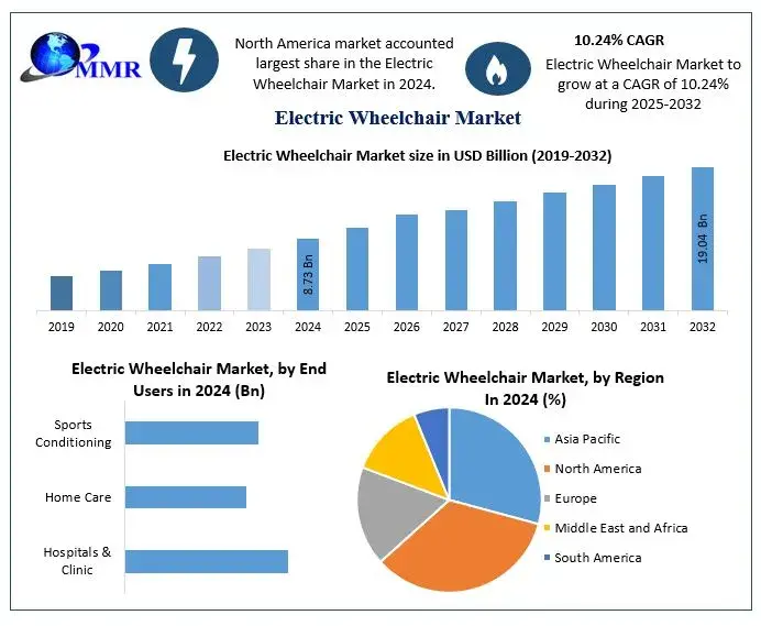 The Electric Wheelchair Market size was valued at USD 8.73 Billion in 2024 and the total Electric Wheelchair revenue is expected to grow at a CAGR of 10.24% from 2025 to 2032, reaching nearly USD 19.04 Billion.