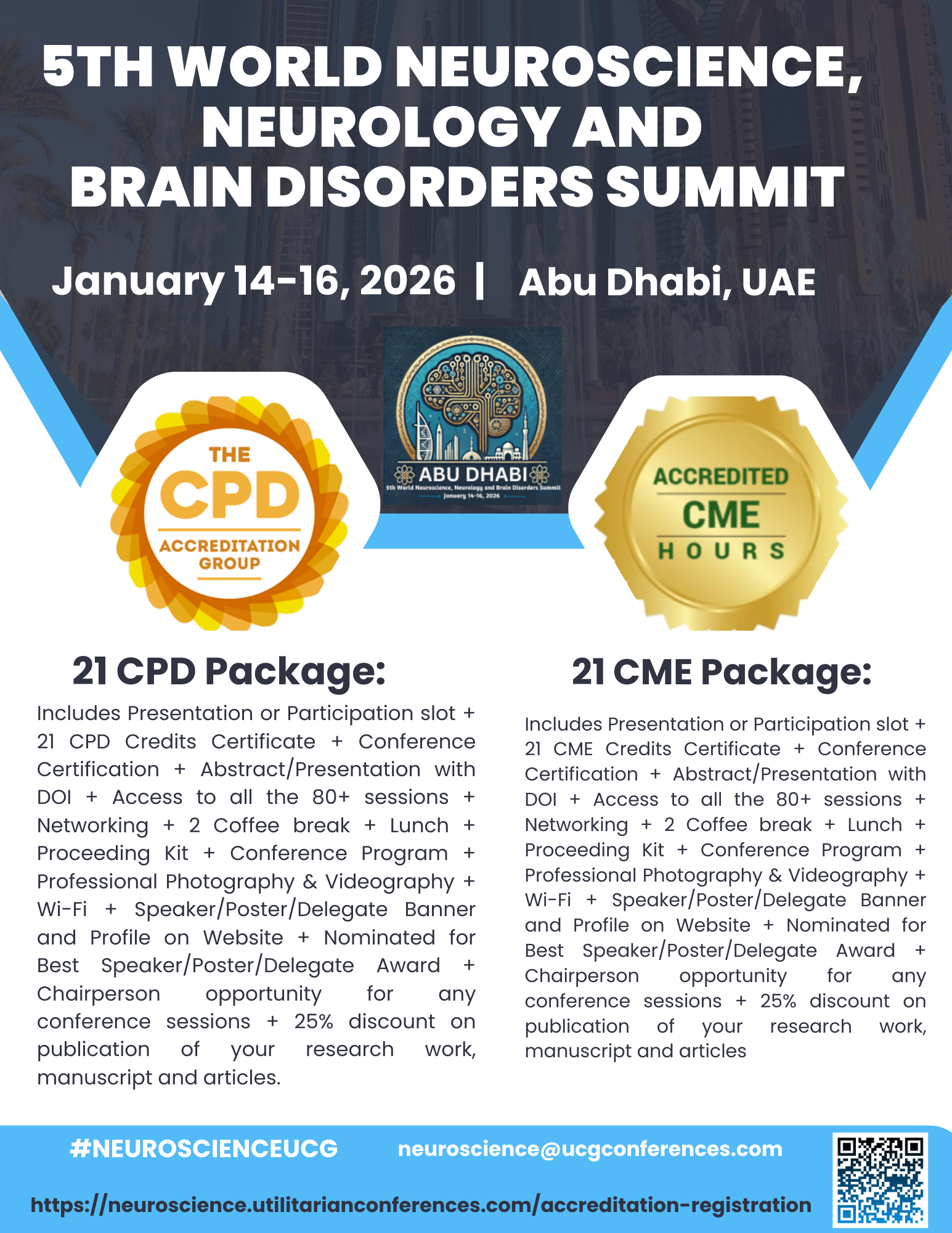 We are thrilled to invite you to the 5th World Conference on Neuroscience, Neurology, and Brain Disorders, taking place from January 14–16, 2026, in the vibrant city of Abu Dhabi, United Arab Emirates.