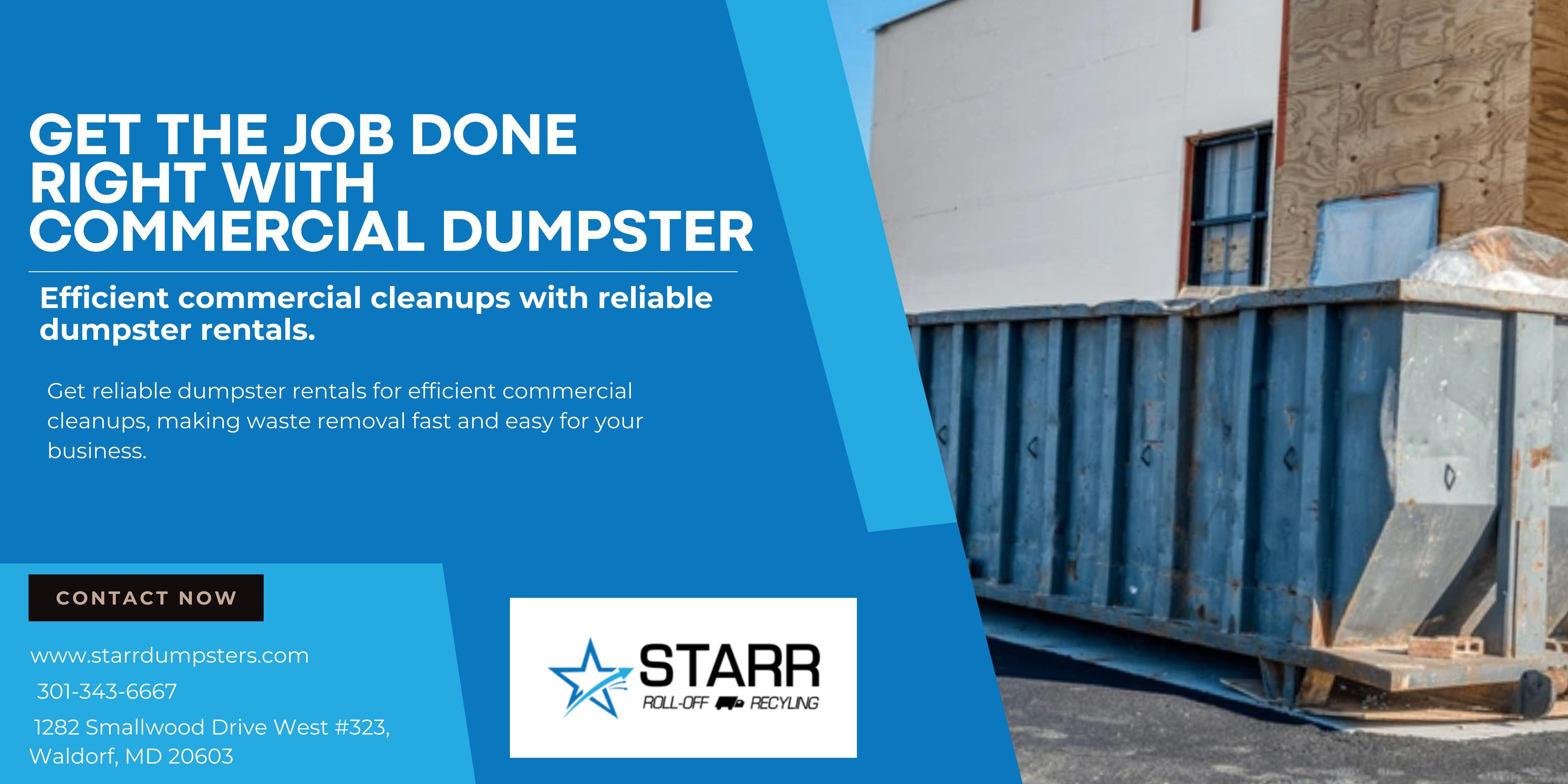 Get the job done right with our reliable commercial dumpster solutions. Whether you're tackling a large-scale cleanup or managing ongoing waste, our qualified dumpster rental services in Washington DC are designed to meet your needs. We offer convenient, cost-effective solutions to help businesses stay organized and maintain clean, clutter-free spaces. Trust our team for fast, efficient, and hassle-free dumpster rental services. Contact now at 301-343-6667 for further assistance!