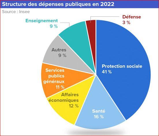 · La Protection Sociale (ASSO) : ~46 % du total. C'est le premier poste de dépense. Il comprend les retraites, l'assurance maladie, les allocations familiales et le chômage.
