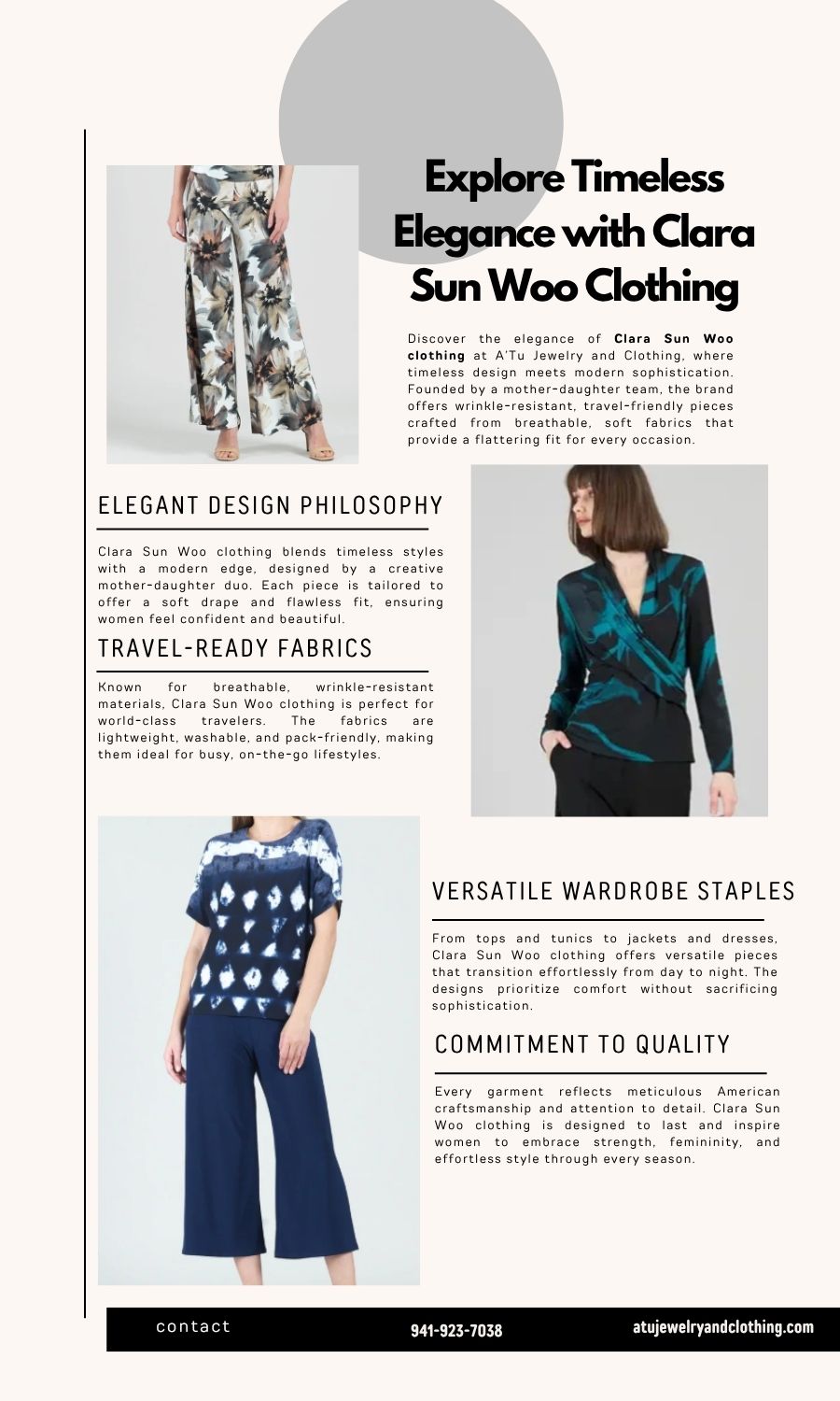 Discover the elegance of Clara Sun Woo clothing at A’Tu Jewelry and Clothing, where timeless design meets modern sophistication. Founded by a mother-daughter team, the brand offers wrinkle-resistant, travel-friendly pieces crafted from breathable, soft fabrics that provide a flattering fit for every occasion. Clara Sun Woo clothing is perfect for women who seek style, comfort, and versatility in their wardrobe. Explore luxurious tops, tunics, jackets, and dresses that effortlessly combine fashion and function. Embrace confidence and grace with Clara Sun Woo’s impeccable craftsmanship and ageless style, designed to accompany you from workdays to weekends.