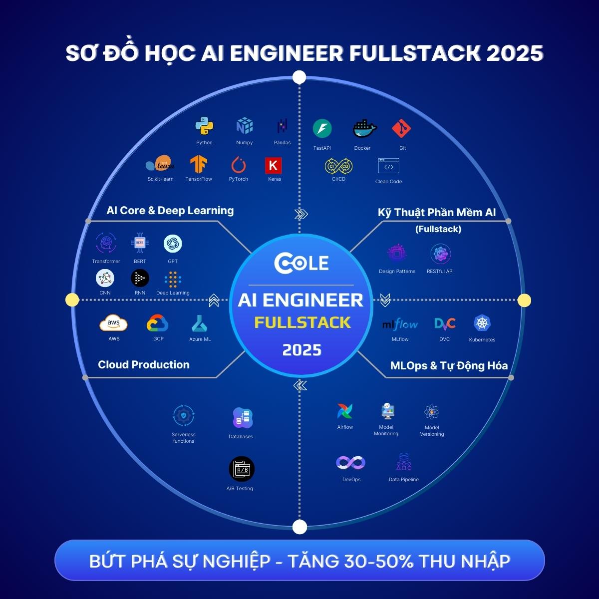 Trong kỷ nguyên AI bùng nổ, một kỹ sư AI (AI Engineer) không chỉ cần biết code mà phải có tư duy hệ thống từ nền tảng đến thực thi. Khóa học AI Engineer Fullstack 2026 được thiết kế đặc biệt để giúp bạn đi từ con số 0 đến việc làm chủ các công nghệ tiên tiến nhất như LLMs, RAG, Computer Vision và AI Agents.