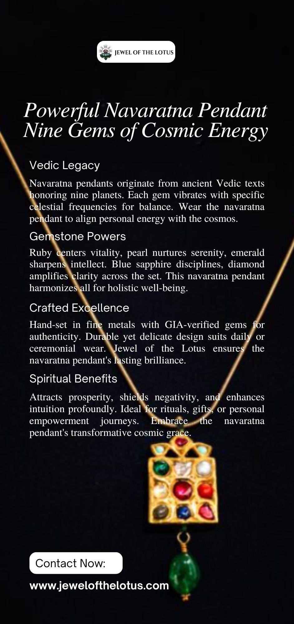 The navaratna pendant from Jewel of the Lotus harnesses the ancient power of nine gemstones—ruby, pearl, emerald, red coral, yellow sapphire, diamond, blue sapphire, hessonite, and cat’s eye—aligned to Vedic planets for harmony. Worn close to the heart, this navaratna pendant promotes prosperity, protection, and emotional balance by channeling celestial rays. Crafted with precision and GIA authenticity, it blends spiritual significance with elegant design, ideal for daily rituals or as a meaningful gift symbolizing universal connection.