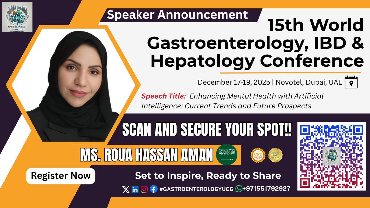 The 15th World Gastroenterology, IBD & Hepatology Conference promises to be a hub of groundbreaking insights, meaningful collaborations, and visionary ideas. With speakers like Ms. Roua Hassan Aman contributing invaluable expertise on the intersection of AI and mental health, attendees can look forward to an enriching and future-forward experience.