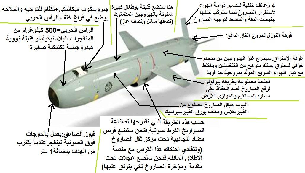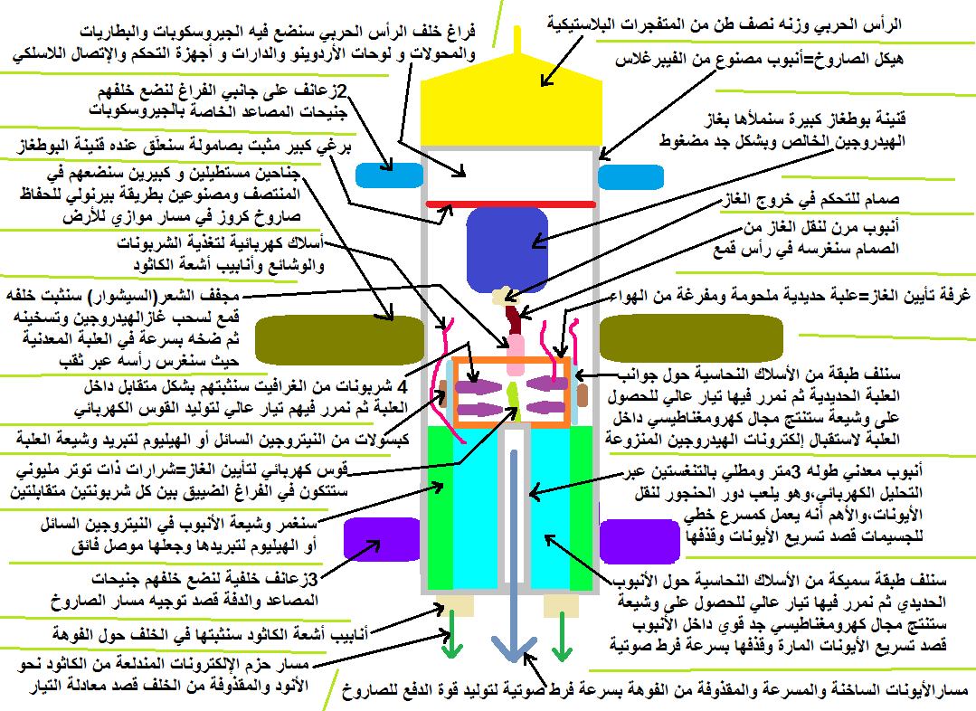 وإليكم صورة توضح تصميم سهل لصناعة صاروخ كروز فرط صوتي يعمل بمحرك البلازمى الأيوني لغاز الهيدروجين ومعجل للجسيمات