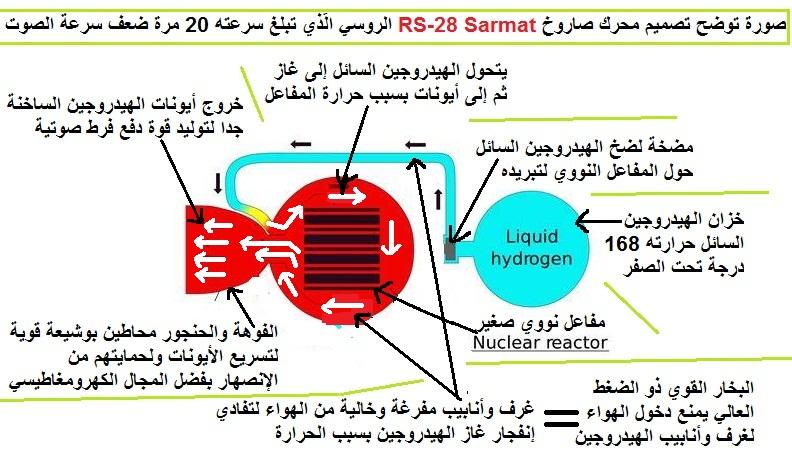 صاروخ سارمات آر-اس هو صاروخ روسي عابر للقارات وزنه يبلغ 220طن بما فيها الرأس الحربي الذي يزن 10طن،ومع ذلك تصل سرعته إلى 20 مرة ضعف سرعة الصوت لأنه يعتمد على محرك البلازمى الأيوني حيث يتم ضخ الهيدروجين السائل وتمريرة حول مفاعل نووي صغير ليحوله لغاز ثم لبلازما أو أيونات وهي بروتونات فقط منزوعة الإلكترونات،ثم تخرج تلك الأيونات من الفوهة بحرارة جد متطرفة مولّدة دفعا هائلا للصاروخ،كما توضحه الصورة أسفله