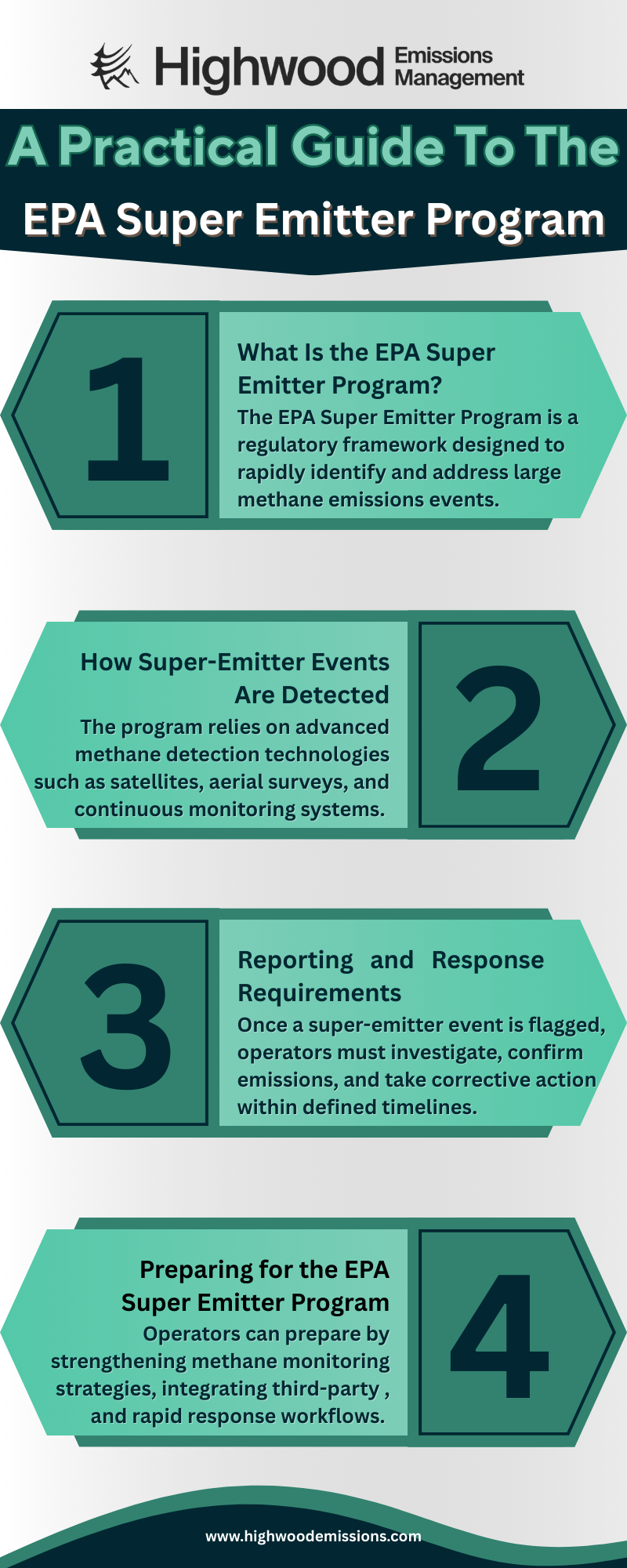 The EPA Super Emitter Program strengthens methane accountability by enabling rapid detection and mandatory response to large emissions events. Using third-party data from satellites, aerial surveys, and advanced monitoring technologies, the program requires operators to investigate, mitigate, and report confirmed leaks within defined timelines. At Highwood Emissions Management, we help oil and gas operators build audit-ready methane programs that reduce compliance risk and support ESG goals. Contact our team to assess your readiness or request a demo today.