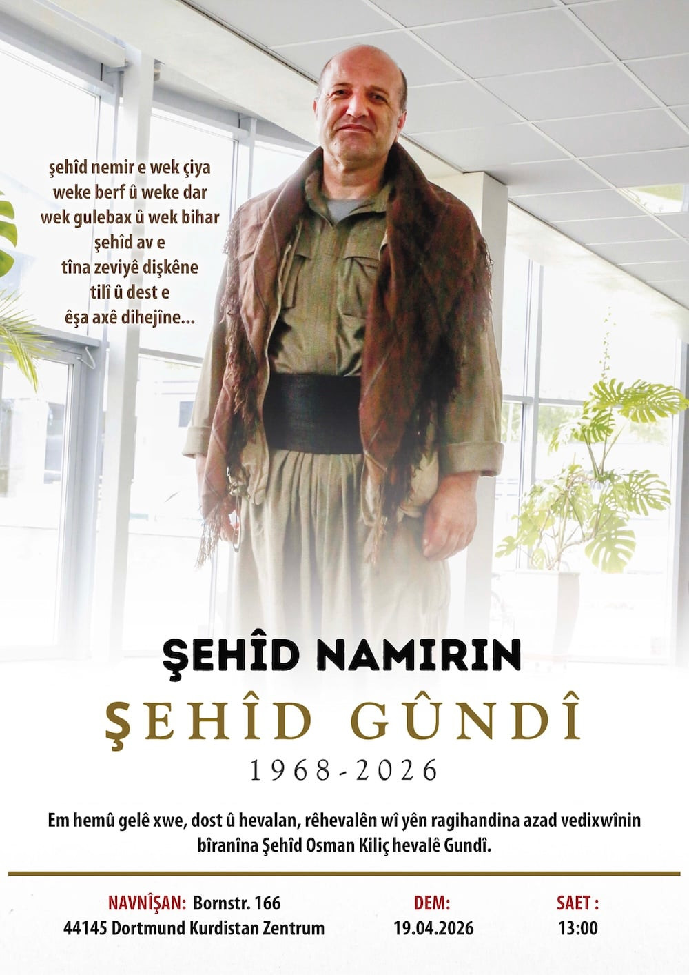Anma, yarın (19 Nisan 2026) saat 13:00’te Dortmund Kürdistan Zentrum’da yapılacak.