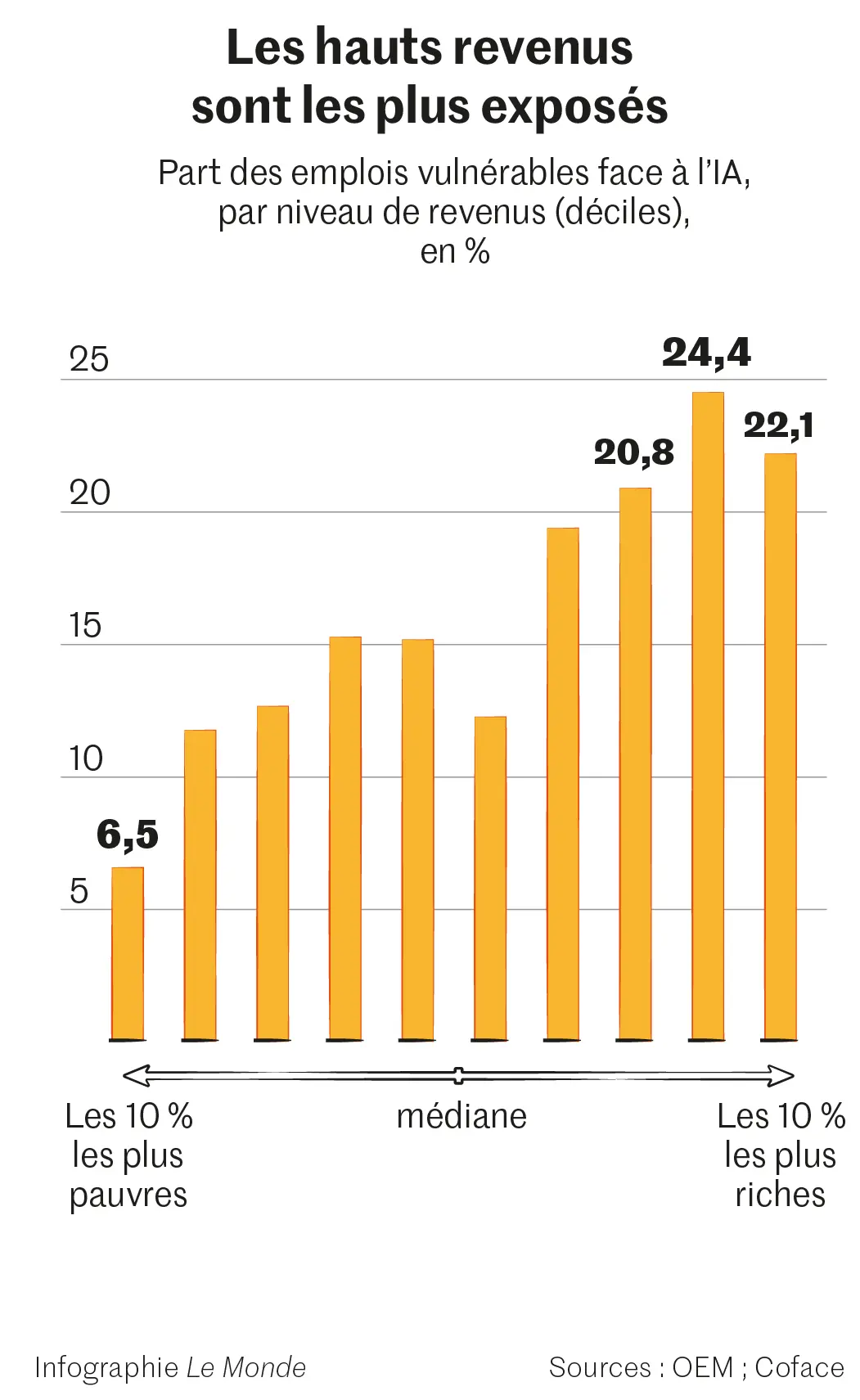 Ce qui est relativement certain, c’est que le déploiement de l’IA ne va pas transformer le marché du travail de la même façon que l’informatique. La révolution Internet a augmenté les inégalités, et a polarisé l’emploi en remplaçant des tâches effectuées sur des emplois intermédiaires. Les effets s’étaient concentrés sur le milieu de la distribution des salaires et avaient préservé, voire avantagé, ceux qui avaient fait des études supérieures. « On s’attend à des conséquences pour des travailleurs d’autres niveaux de qualification », avance Grégory Verdugo. Selon Coface, les trois plus hauts déciles de revenus sont ainsi menacés à plus de 20 %. A l’inverse, certains secteurs ou professions seront difficiles à automatiser. Parmi les métiers les moins en danger figurent ceux du nettoyage et de l’entretien des bâtiments ainsi que des espaces extérieurs (5,4 %), ceux liés à l’agriculture, à la pêche et à la sylviculture (7,9 %) ou à la restauration (7,5 %).