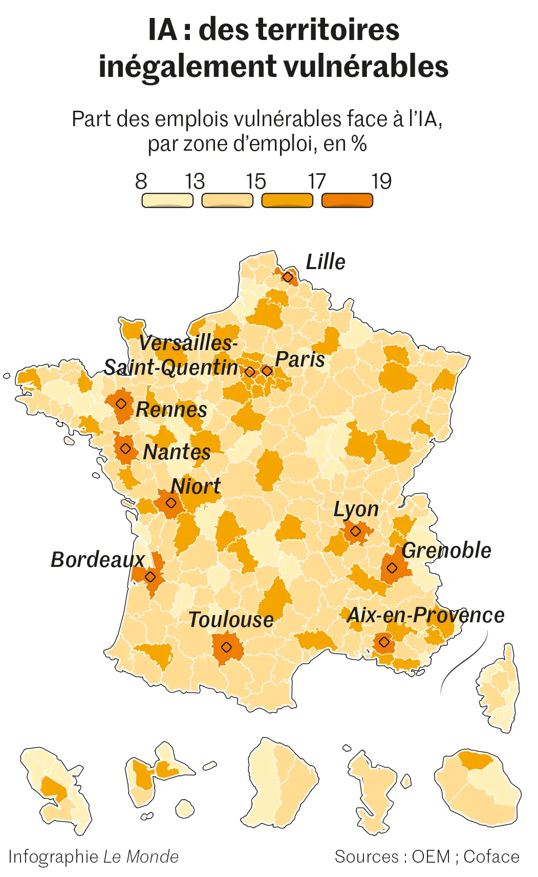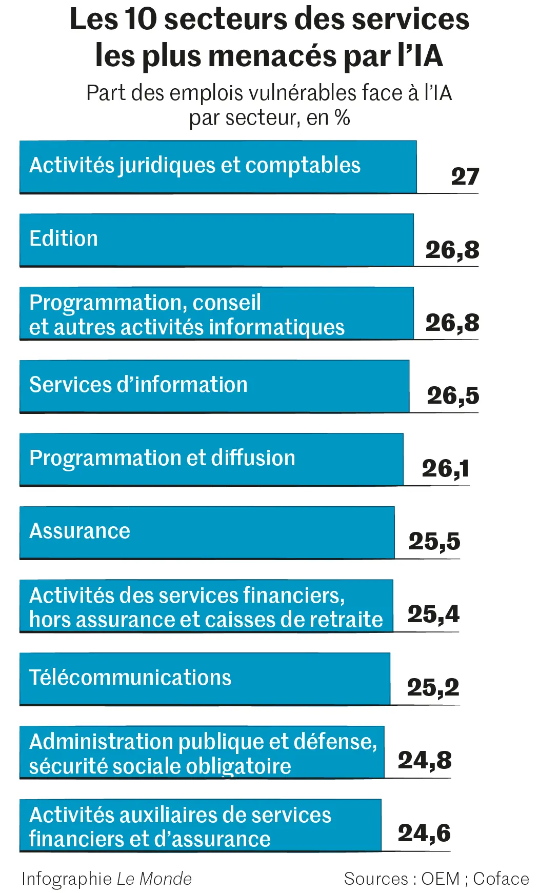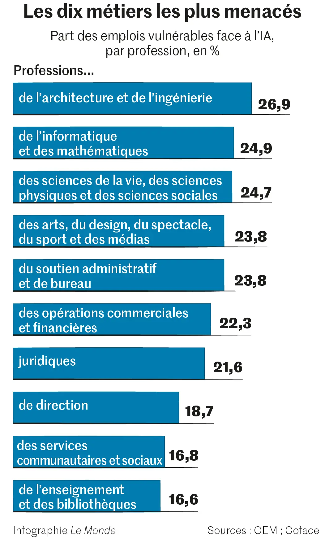 Parmi les familles de professions exposées ressortent en premier celles de l’architecture et de l’ingénierie (26,9 % de l’emploi à risque), de l’informatique et des mathématiques (24,9 %) – avec un pic à 31 % pour l’informatique –, ou celles du soutien administratif et de bureau (23,8 %). Il s’agit d’activités en général très qualifiées, bien rémunérées : ainsi les 10 % des plus hauts revenus de la population française sont menacés à hauteur de 22,1 %.
