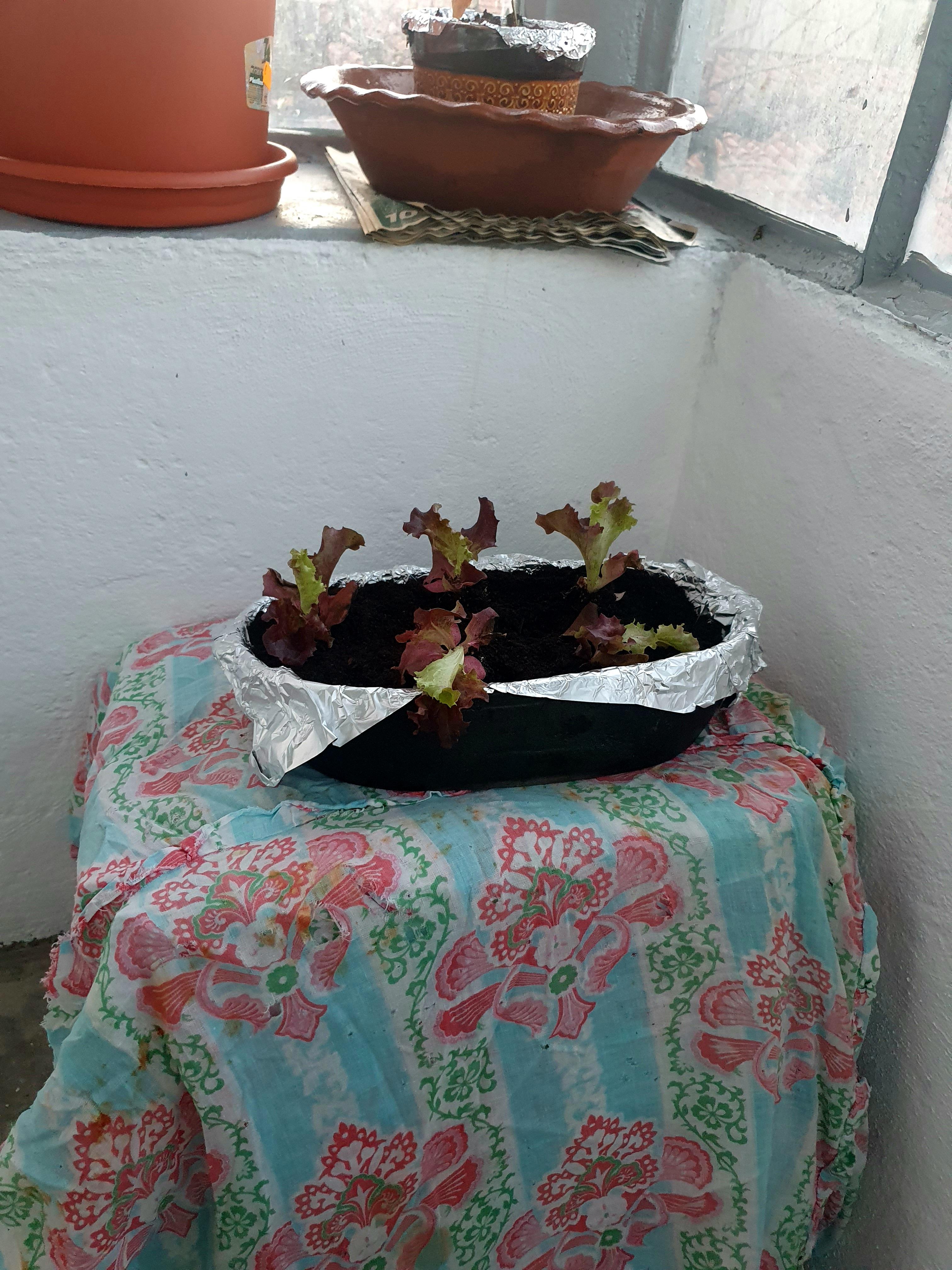 The nice flower pot had a crack. It was lined with a plastic bag and tin foil.