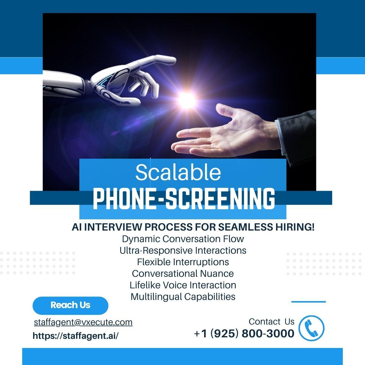 Transform your hiring process with StaffAgent.AI's advanced phone-screening technology. Benefit from dynamic conversation flow, ultra-responsive interactions, and lifelike voice interaction. Contact us at staffagent@vxecute.com or visit https://staffagent.ai. Call +1 (925) 800-3000.