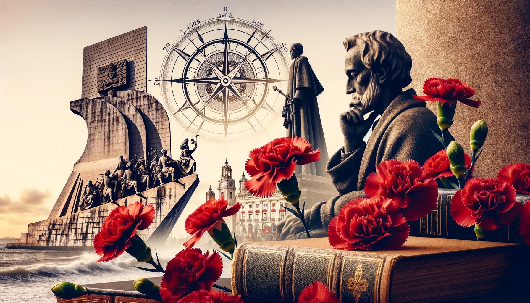 Red Carnations: Scattered in the foreground to symbolize peace and reflection, nodding to the spirit of the Carnation Revolution.