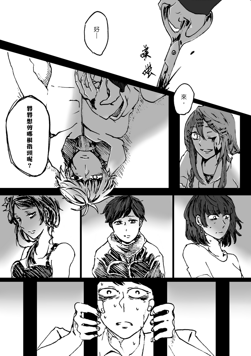想要什麼?手指嗎?眼睛嗎?或是更裡面一點的東西?咯咯笑的紙條底下銳利刀鋒嘎吱剪開骨頭發出清脆到讓人心驚的響聲。遊戲還在中途喔請務必欣賞用心良苦製作的CG流程--皮膚底下的看清楚了嗎?需要湊近點嗎?需要親身體驗嗎?打了麻醉的那個人看起來並不痛苦吧?看哪看哪,這是必定會發生的事實與迴避不了的畫面不是嗎?女孩咧開的嘴很開心很開心啊。