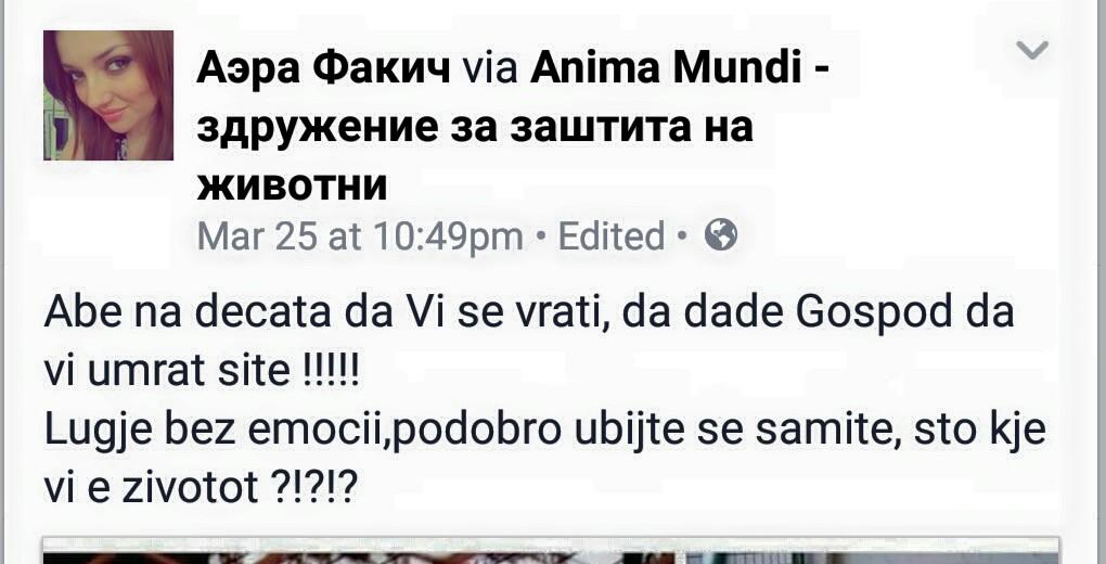 Sev Bekir Вук, баш од 12-16 е работно време на повеќето од активистите. А тие што не работат поголемиот дел до денот се со повредени мачки и кучиња. А кажи ми која е одговорноста на АМ ако некој од сите тие 30000 фанови искоментира нешто вакво? Банирани се луѓе со вакви и слични коментари, ама да се очекува дека е можно сите 30000 фанови да се пратат што коментар ќе стават при секое споделување на пост на АМ е премногу. И како што можам да приметам нормално комуницираш со некој што „лапнал многу заебан трип кој му го спржил мозокот, бил кретен а сега е ретардиран“.