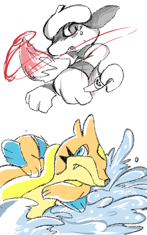 「要上了喔,夕紀。」上次出戰已和圖圖犬後輩培養出一定的配合默契,波導轉化的水氣從浮潛鼬腳踏之處溢流,與鮮紅的筆觸連成一氣。