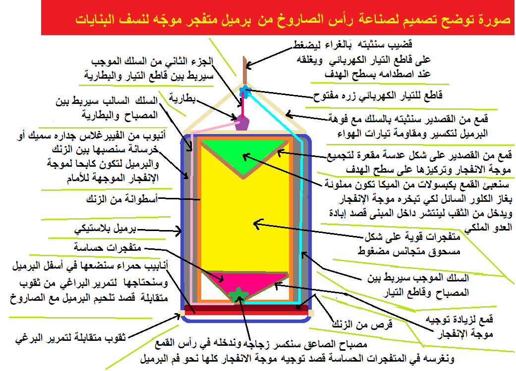 أو سنضع في الرأس الحربي قنبلة نووية إندماجية تكتيكية صغيرة،تولّد إنفجار حراري نظيف بقوة آلاف الأطنان من المتفجرات الكيميائية،وإليكم رابط موقع يشرح 14 طريقة لصناعة قنابل نووية هيدروجينية إندماجية لتدمير قصور الملك والقواعد العسكرية الموالية له ومخازن أسلحتهم خلال الثورة