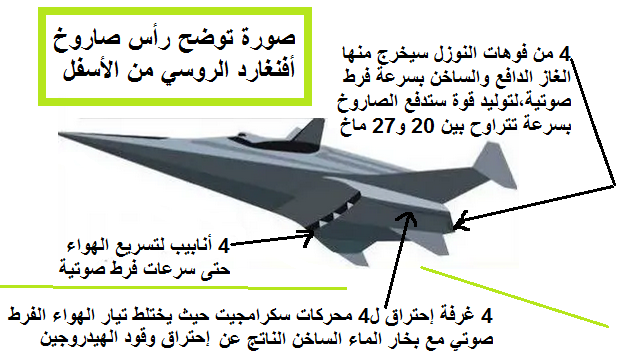 وإليكم صورة توضح تصميم لصارخ كينجال الروسي وهو صاروخ كروز بمحرك سكرامجيت الفرط صوتي، حيث تبلغ سرعته 10 ماخ أي 12350 كيلومتر في الساعة