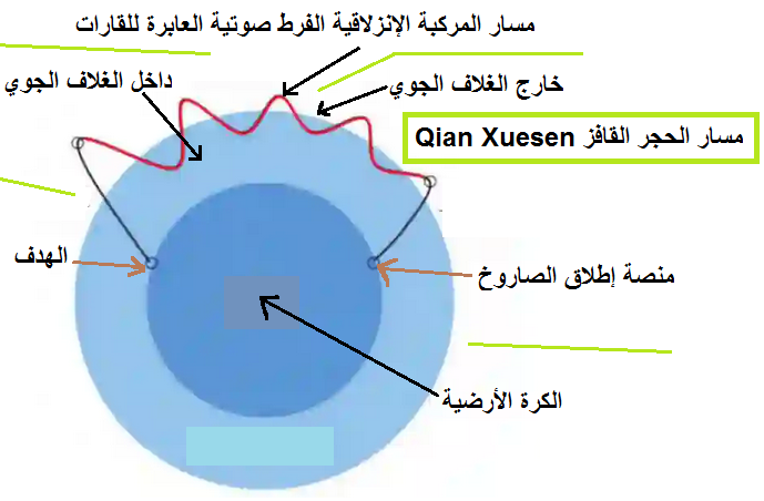 وإليكم صورة توضح مسار “الحجر القافز” لمساعدة المركبات الثقيلة على القفز من الغلاف الجوي,والذي تنهجه المركبة الإنزلاقية الفرط صوتية الصينية