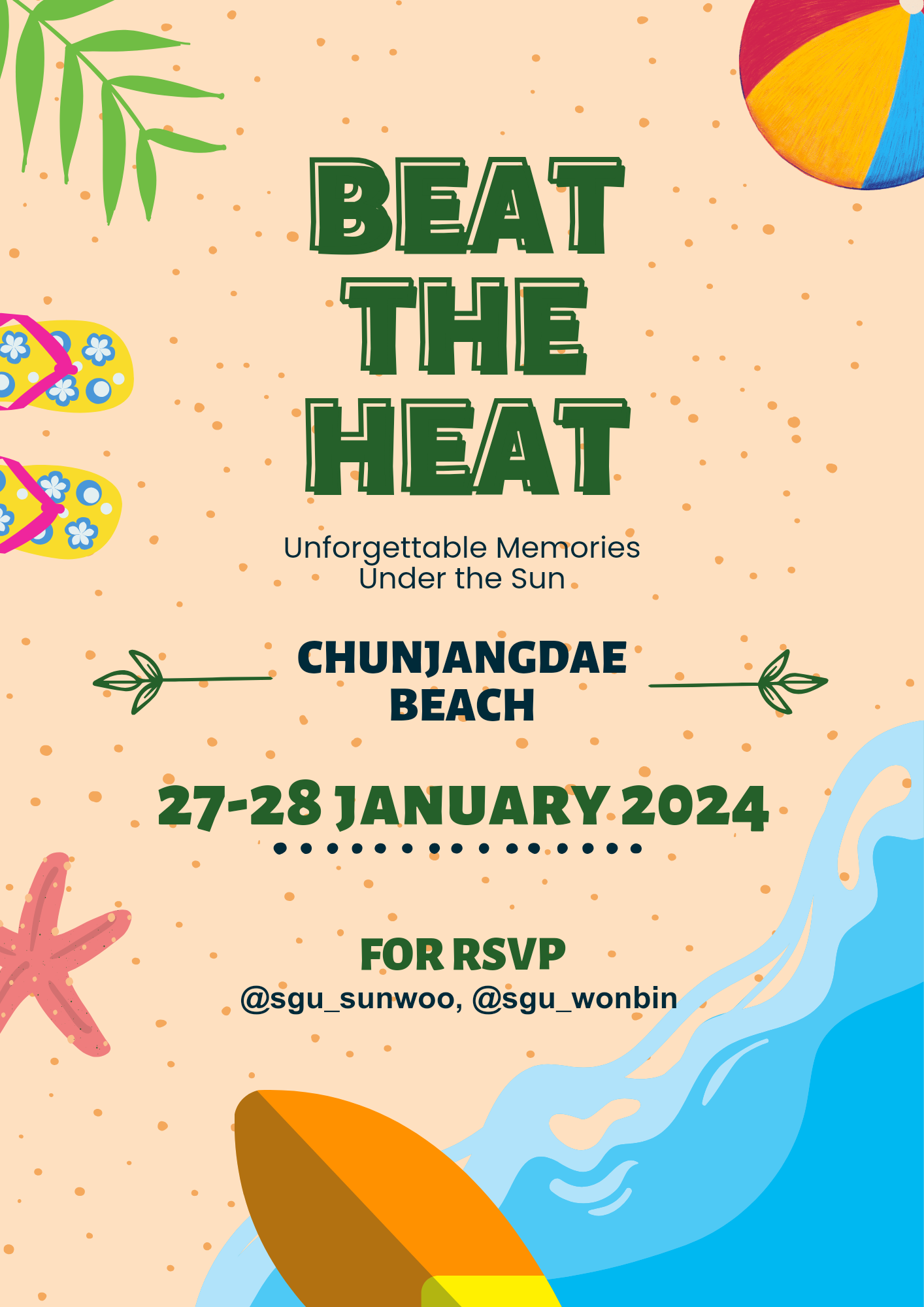Beat The Heat adalah event yang diselenggarakan pada tanggal 27-28 Januari 2024 untuk menyambut para Clovers yang baru bergabung ke dalam keluarga besar Universitas Segyeong. Acara ini juga dapat dihadiri oleh para member dari batch 1 yang kami cintai. Mari bersenang-senang bersama dan saling mengakrabkan diri!