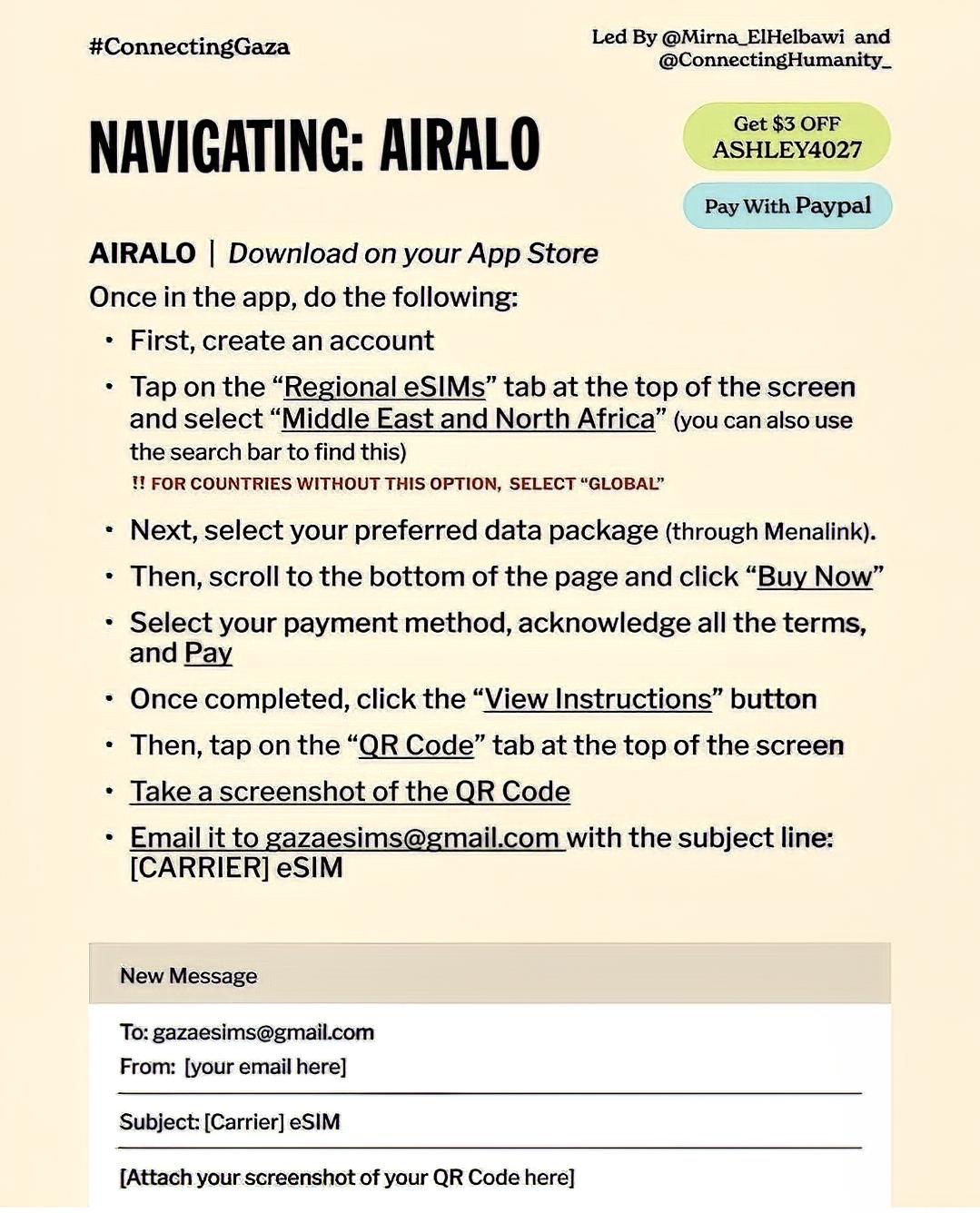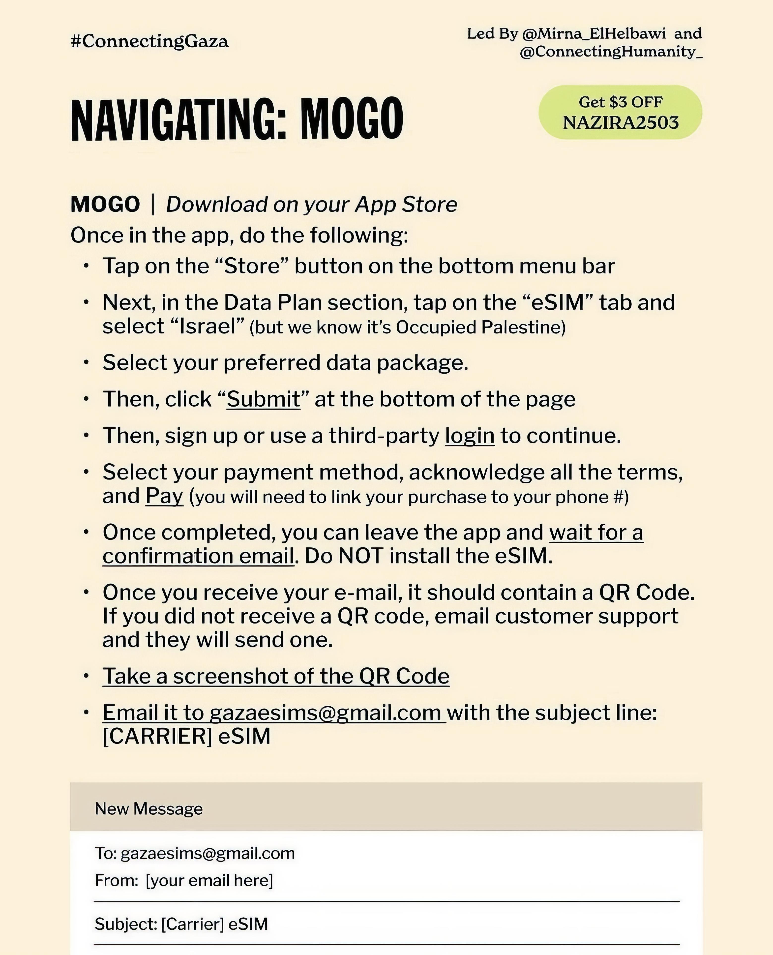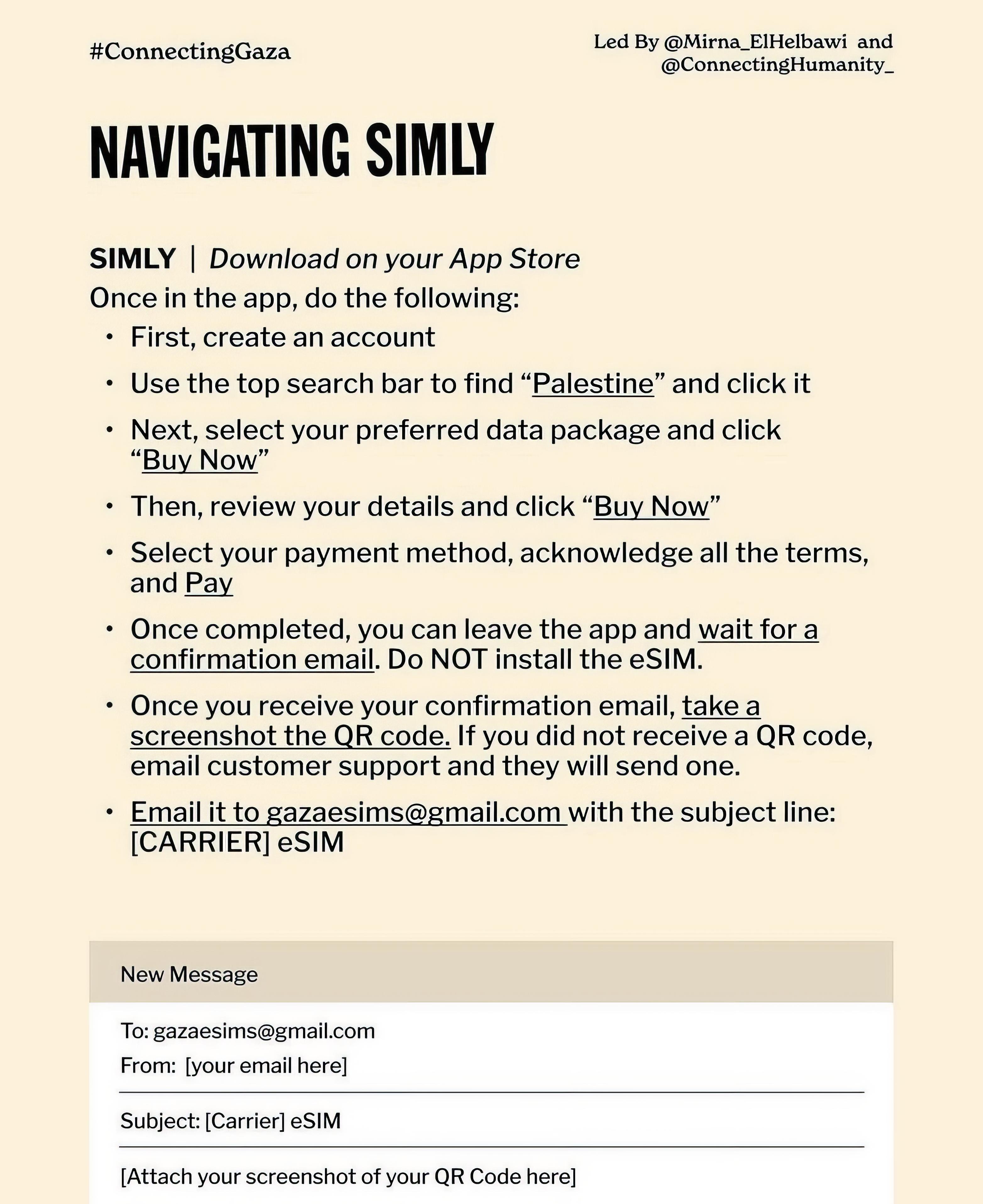 - Send your purchase QR code to: gazaesims@gmail.com with subject line: