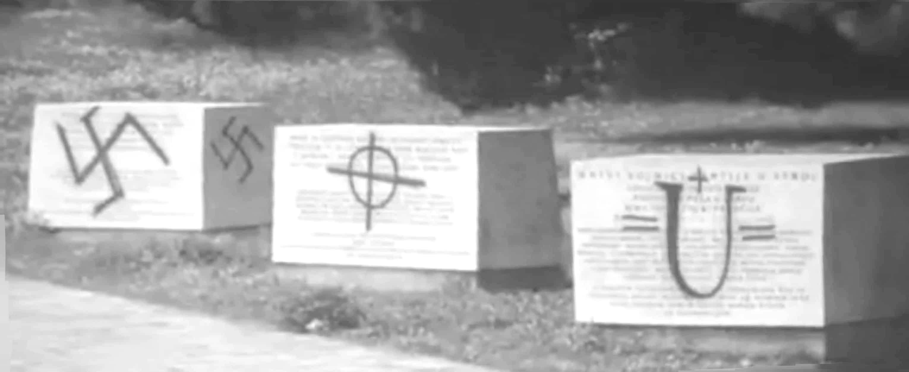 Ovo su vandalizirani spomenici partizanima gdje se keltski križ pojavljuje uz svoje ekvivalente - svastiku i ustaško "U" s križem.