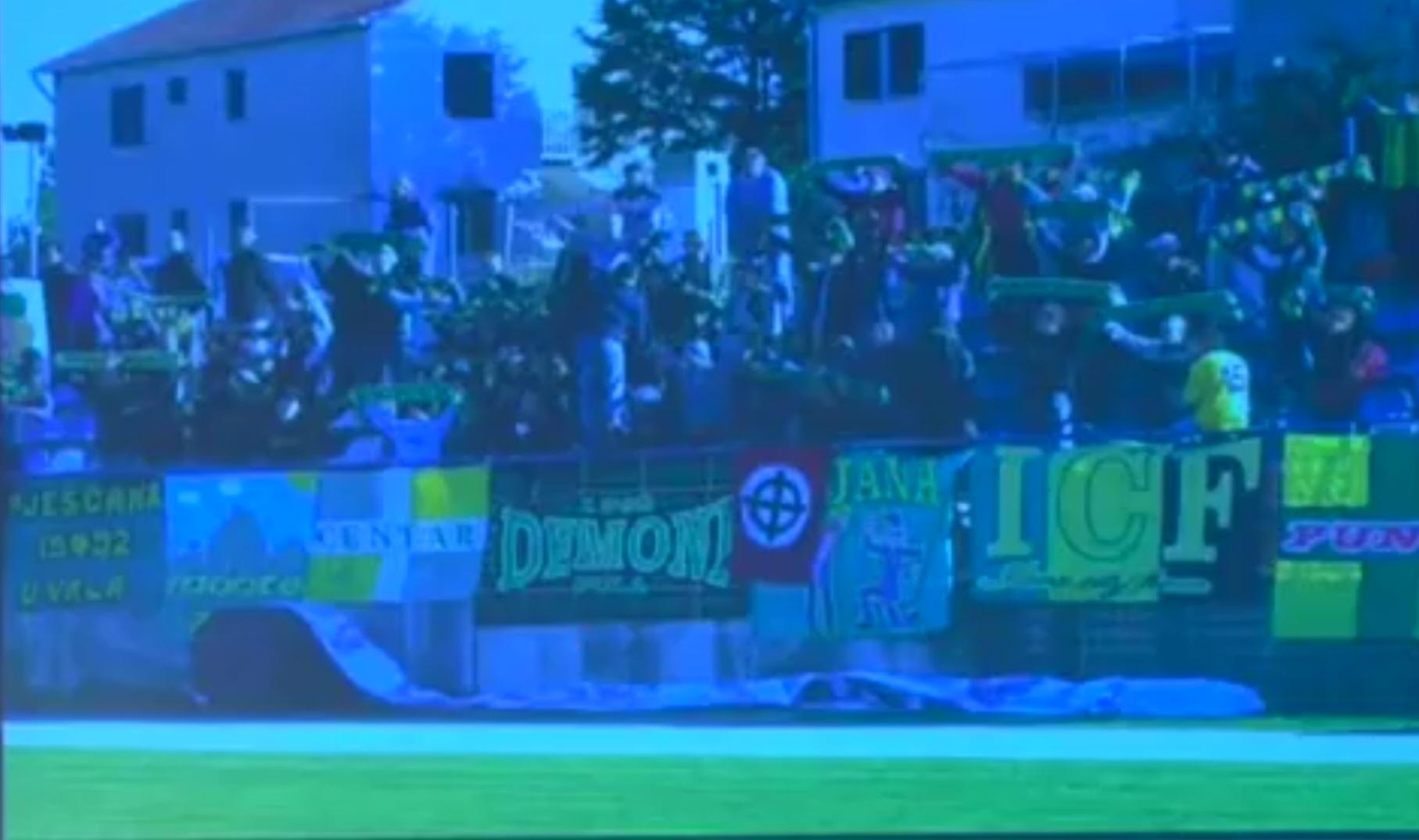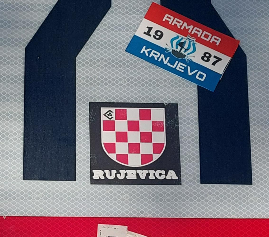 U središtu značke nalazi se stilizirano slovo A, no taj dodatni element ne negira niti poništava cjelokupnu podlogu simbola. Riječ je o nedvojbeno prepoznatljivoj zastavi Nezavisne Države Hrvatske. Ustaška zastava zabranjena je zakonom RH. Takva zastava istaknuta je na utakmici Hrvatske i Latvije 2023. godine koja se u sklopu kvalifikacija za Euro igrala upravo na Rujevici u Rijeci. Tamo su je donijela i raširila trojica gledatelja. Oni su identificirani i osuđeni, a tom je prilikom kažnjen i Hrvatski nogometni savez.