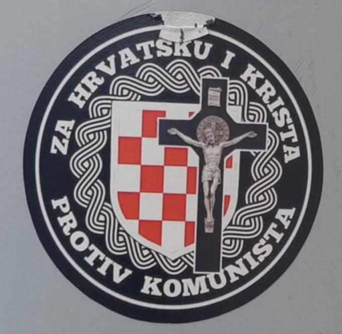 Kada već govorimo o Nezavisnoj Državi Hrvatskoj i njezinoj simbolici, ovdje se zadržavam i na naljepnici zastave koju sam uočila u autobusu Autotroleja i koja je, nakon objave moje reakcije, odmah uklonjena (iako ju se i dalje može vidjeti po ulicama, prvenstveno Pećina).