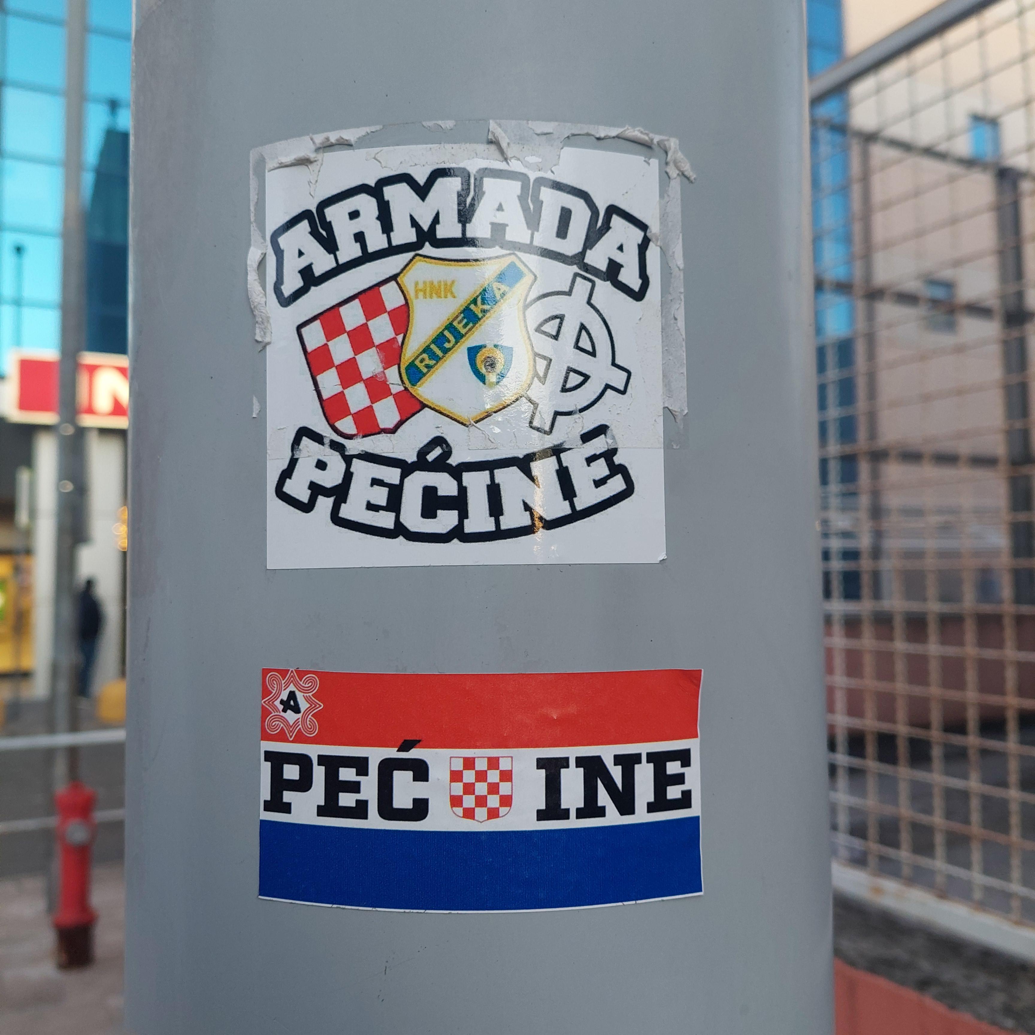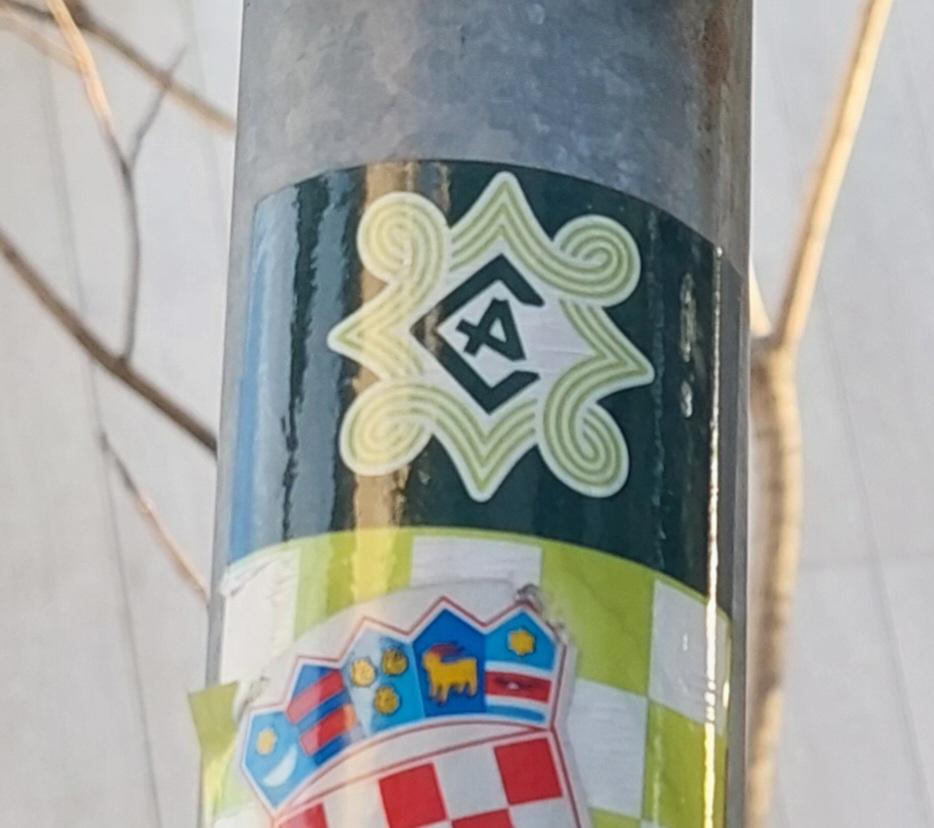 Ovdje opet vidimo malo izmijenjenu tropletu viticu kombiniranu sa stiliziranim slovom A i postavljenu na naljepnicu. Takva kombinacija upućuje na svjesno korištenje povijesne ustaške ikonografije u suvremenom kontekstu ulične propagande.