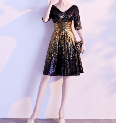 For any kind of party, a glitter knee-length gown is a perfect choice. This dress is bold and allows you to be bold. This dress is great for showing off your fitness.
