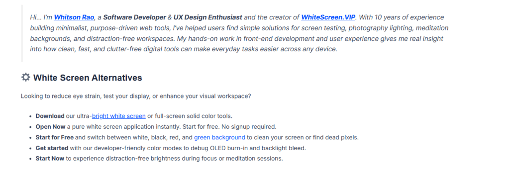 This website is an independent online utility tool created to help users access blank white screens, color screens, and display-testing features. We are not affiliated with, endorsed by, or connected to any hardware manufacturers, device brands, or software companies. All trademarks, logos, and brand names mentioned on this website belong to their respective owners.