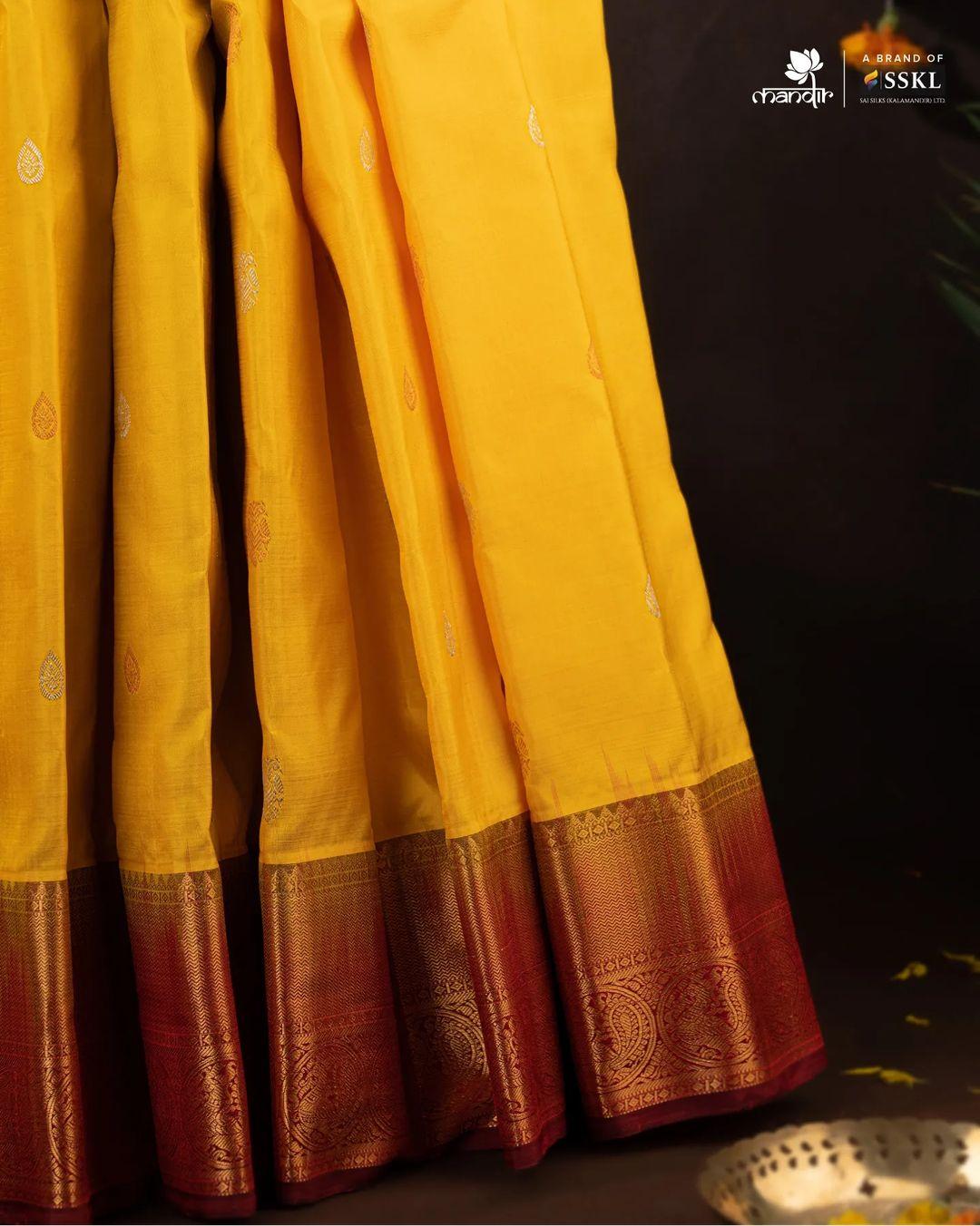 The Yellow Gadwal Saree is a stunning piece of traditional Indian attire that is perfect for any special occasion or festive celebration. The body of the saree is adorned with intricate buttis, which are small motifs or designs that are woven into the fabric. These buttis add a subtle elegance to the saree and give it a unique texture and depth. The yellow colour of the saree is bright and vibrant, making it a perfect choice for a festive occasion.